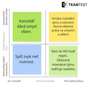 2. Vodorovná osa (Individuální potřeba): Jaké jsou preference jednotlivců v týmu? Pohybují se od přání být "jen v kanceláři" až po preferenci "plně vzdáleného přístupu".